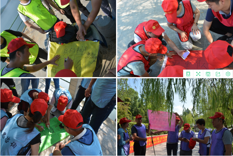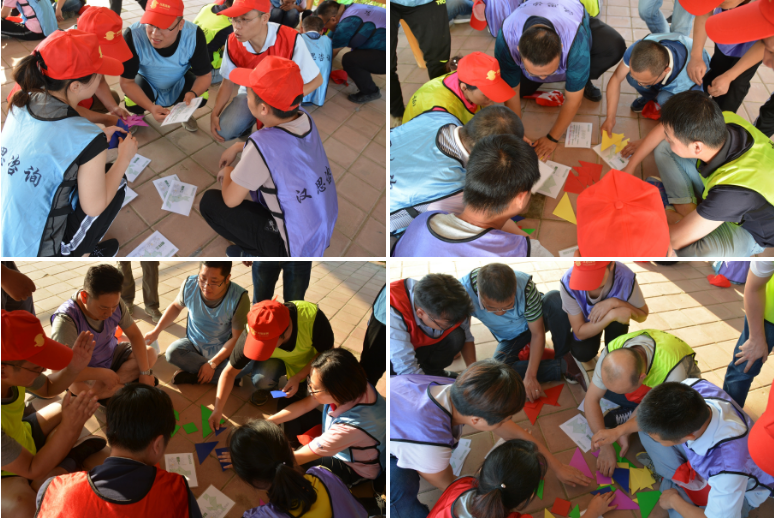 鑒于此次活動(dòng)的參與人員跨部門(mén)、跨專(zhuān)業(yè)、跨層級(jí),為保證所有人員的迅速融入,在隨機(jī)分成4組后,進(jìn)行了“解手環(huán)”等兩個(gè)簡(jiǎn)單活動(dòng)的預(yù)熱,讓小組成員之間迅速的熟悉起來(lái),為后續(xù)的團(tuán)隊(duì)組建及文化展示奠定了良好的基礎(chǔ)。4組隊(duì)伍在創(chuàng)建團(tuán)隊(duì)隊(duì)名、口號(hào)、隊(duì)標(biāo)及基本隊(duì)伍操練后,進(jìn)行了士氣昂揚(yáng)的團(tuán)隊(duì)展示。